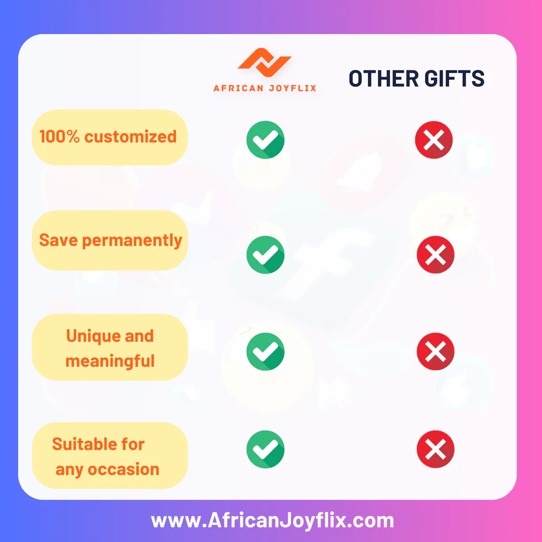 Send the video to friends and family and don’t forget to capture their priceless reactions. You can share your happy moments on social media and tag us @africanjoyflix and we will regularly select lucky customers with great gifts.
